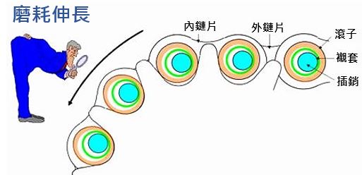 當(dāng)「鏈條」與「鏈輪」咬合時,插銷與襯套間的摩合會發(fā)生摩耗