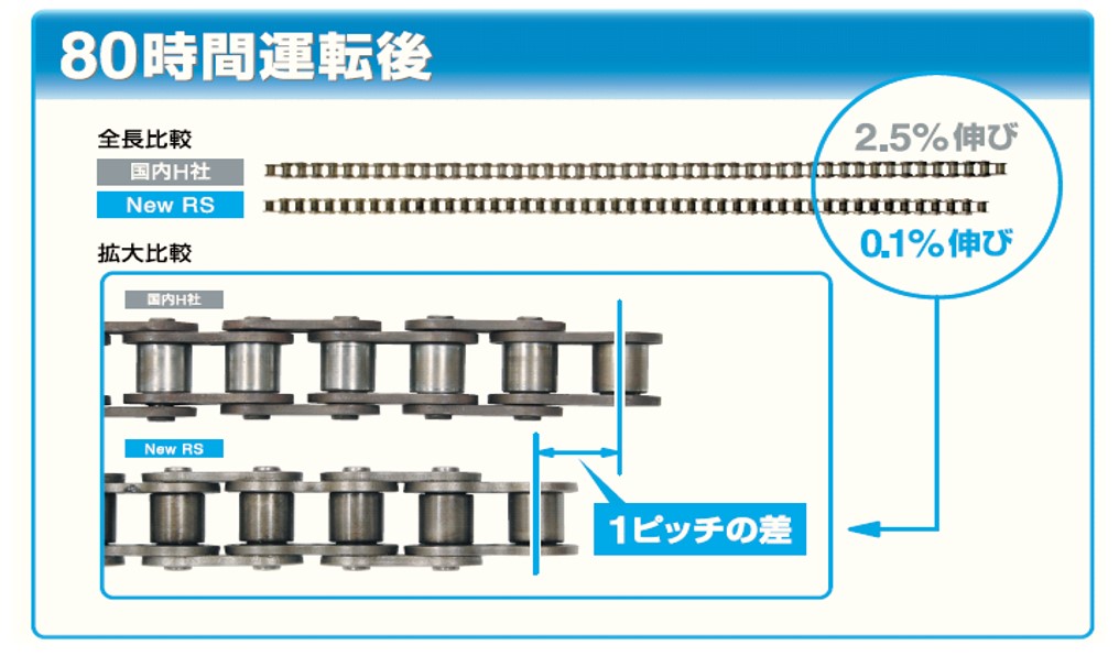 椿本G8世代鏈條大幅減緩了鏈條磨耗率,磨耗伸長率僅為他社的1/4