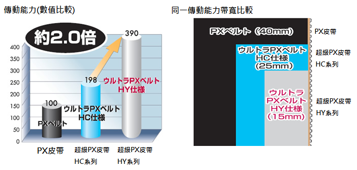 傳動(dòng)能力是超級(jí) PX 皮帶 HC 系列的 1.3~2.0 倍,適用於高頻率裝置和減少重量。