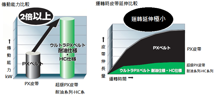 與超級PX皮帶 HC系列的傳動能力相同,運(yùn)轉(zhuǎn)延伸極少,傳動精度高